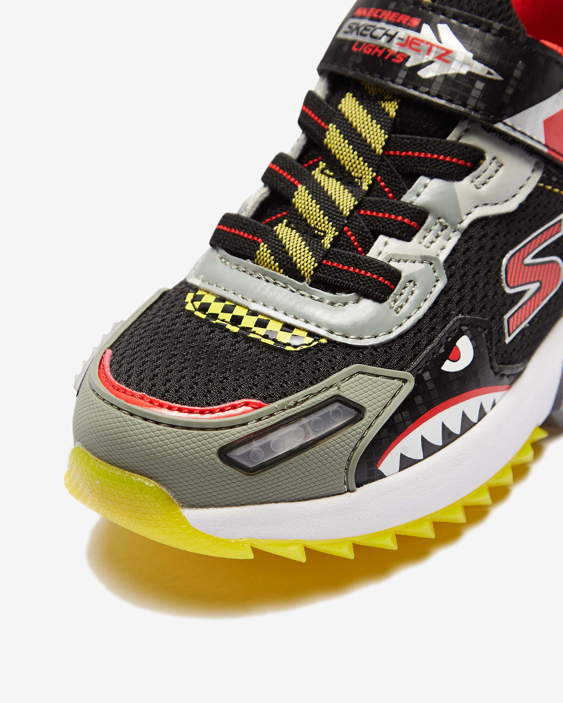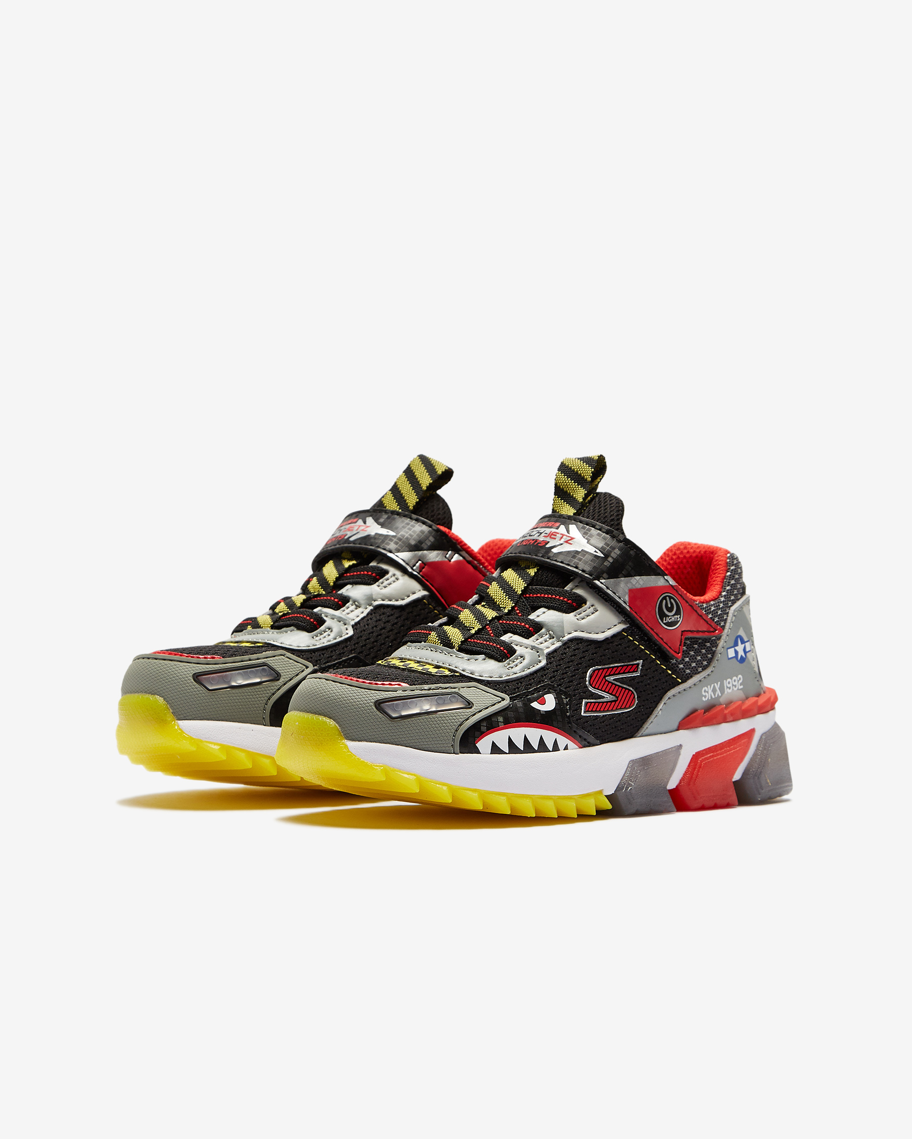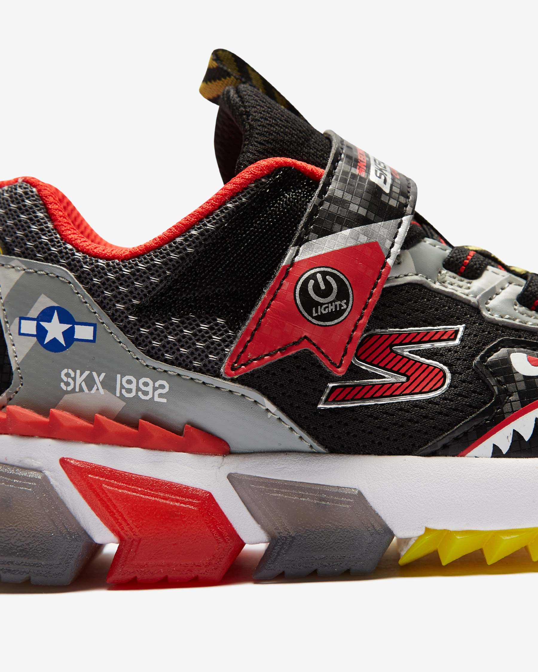 • Skech-Jetz Light ayakkabı ile çocuğunuzun adımlarına biraz ışıltı katın. Baştan sona jetlerden ilham alınarak tasarlanan Skech-Jetz Light ayakkabının sayası, havacılık ve uçuş temalarına ait öğelerden oluşur. Bu renkli ve iddialı tasarım sentetik malzemelerin ve atletik mesh kumaşın bir karışımıdır. Mesh kısımlar esnekliği ve nefes alabilen yapıları sayesinde çocuğunuzun ayaklarının gün boyu kuru kalmasına yardımcı olurken, sentetik kısımlar hem ayakkabının tasarımına hem de çocuğunuzun ayaklarının stabilitesine katkıda bulunur. Üzerinde yer alan esnek bağcıklar ve cırt cırtlı bant sayesinde kolayca giyilip çıkartılabilen Skech-Jetz Light ayakkabı her yönüyle eğlenceli ve konforlu bir ayakkabıdır. İç ve orta tabanında yer alan dolgu malzemesi her adımda çocuğunuza yumuşacık bir yürüyüş deneyimi yaşatır. Tabanında yer alan ışıklar çocuğunuz adım attıkça ışıl ışıl yanarak harika bir görüntü oluşturur. Dış tabanında kullanılan esnek yapılı kauçuk sayesinde üstün yer tutuşu sağlayan Skech-Jetz Light, çocuğunuzun yere daha dengeli basmasına ve bu sayede de olası kazalardan korunmasına yardımcı olur.
