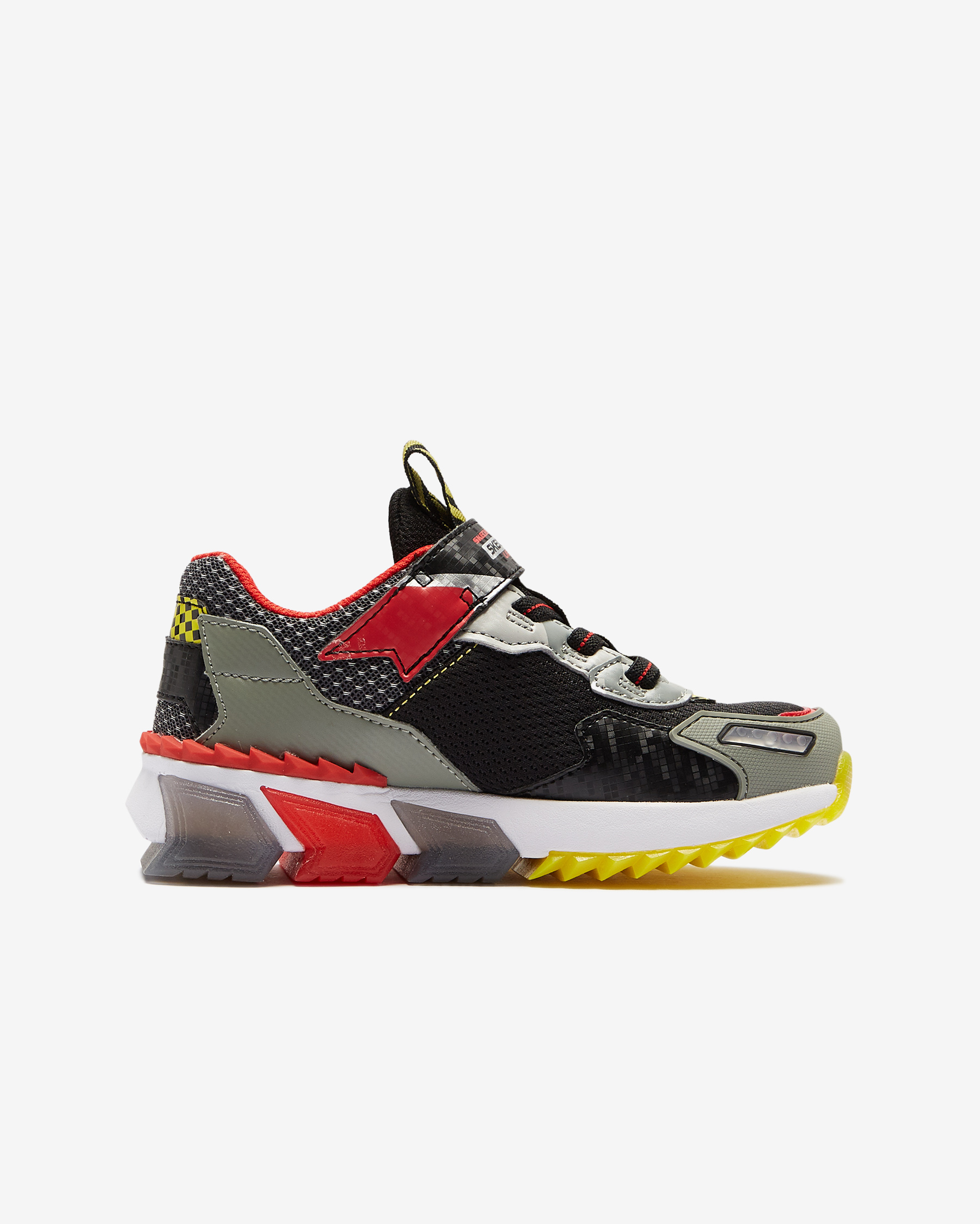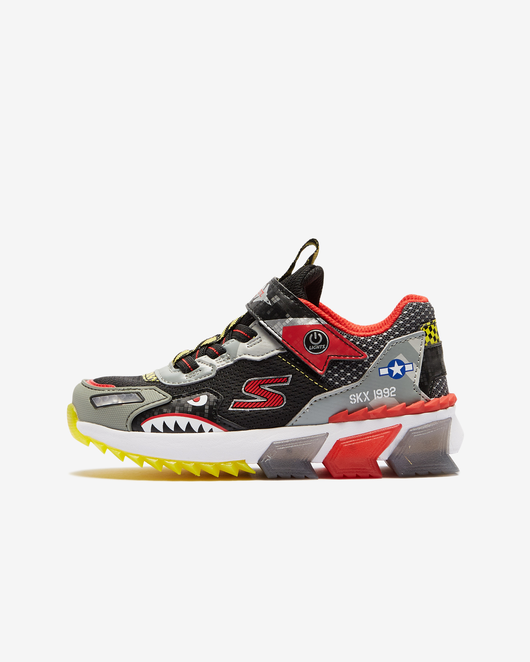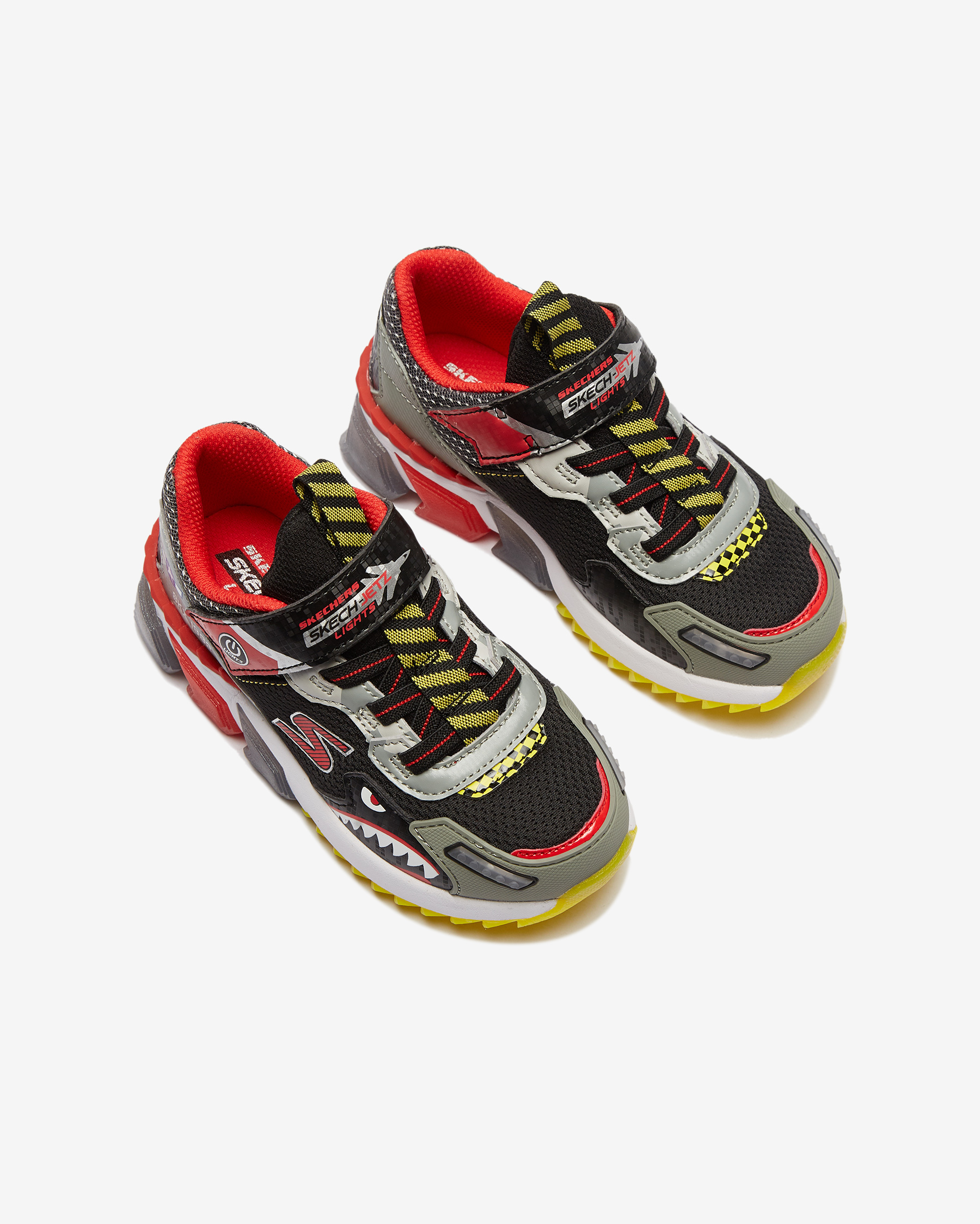 • Skech-Jetz Light ayakkabı ile çocuğunuzun adımlarına biraz ışıltı katın. Baştan sona jetlerden ilham alınarak tasarlanan Skech-Jetz Light ayakkabının sayası, havacılık ve uçuş temalarına ait öğelerden oluşur. Bu renkli ve iddialı tasarım sentetik malzemelerin ve atletik mesh kumaşın bir karışımıdır. Mesh kısımlar esnekliği ve nefes alabilen yapıları sayesinde çocuğunuzun ayaklarının gün boyu kuru kalmasına yardımcı olurken, sentetik kısımlar hem ayakkabının tasarımına hem de çocuğunuzun ayaklarının stabilitesine katkıda bulunur. Üzerinde yer alan esnek bağcıklar ve cırt cırtlı bant sayesinde kolayca giyilip çıkartılabilen Skech-Jetz Light ayakkabı her yönüyle eğlenceli ve konforlu bir ayakkabıdır. İç ve orta tabanında yer alan dolgu malzemesi her adımda çocuğunuza yumuşacık bir yürüyüş deneyimi yaşatır. Tabanında yer alan ışıklar çocuğunuz adım attıkça ışıl ışıl yanarak harika bir görüntü oluşturur. Dış tabanında kullanılan esnek yapılı kauçuk sayesinde üstün yer tutuşu sağlayan Skech-Jetz Light, çocuğunuzun yere daha dengeli basmasına ve bu sayede de olası kazalardan korunmasına yardımcı olur.